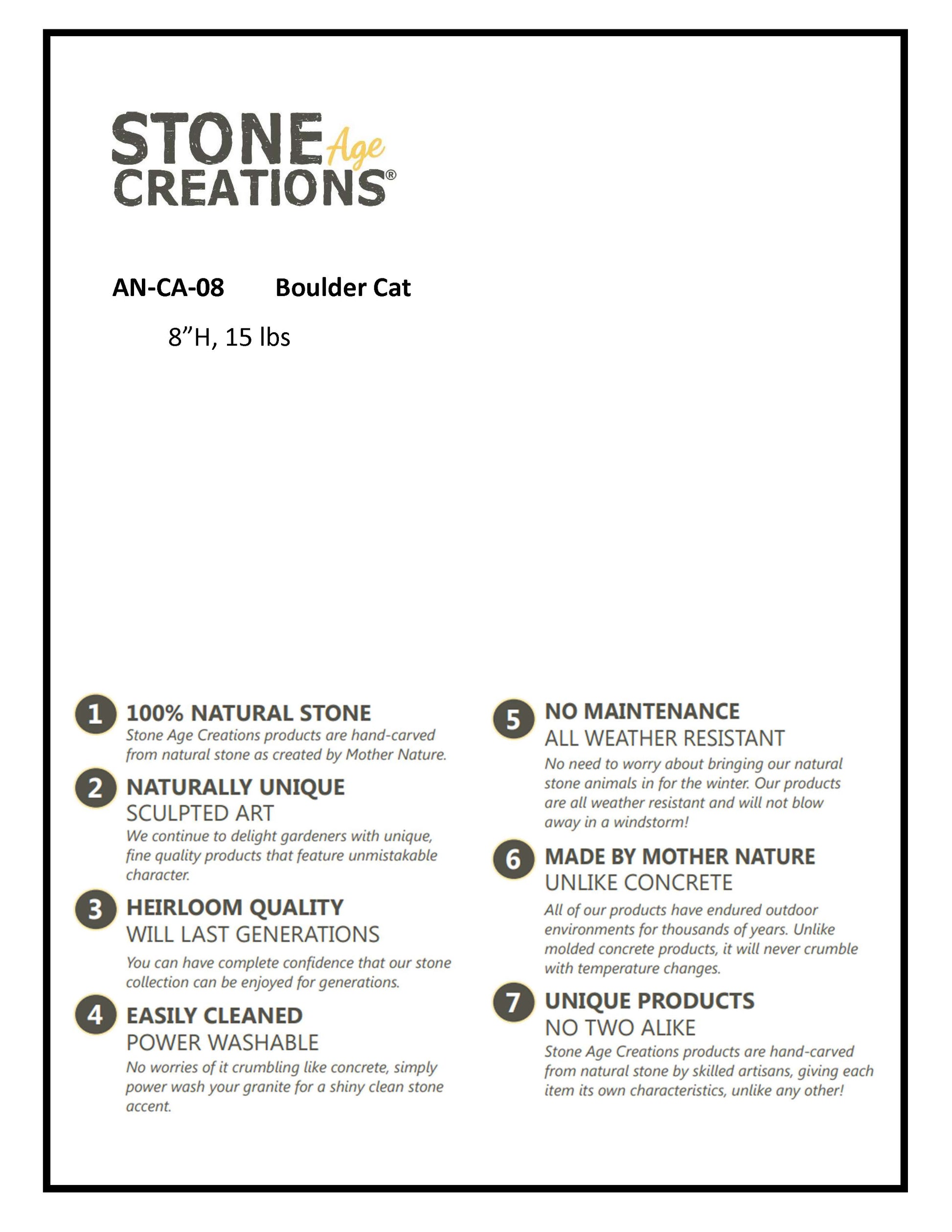 Granite boulder. Natural boulder body with hand-carved accents. Each cat has its own unique characteristics. Since each boulder pet is unique height and weight are approximate. 8" H 12-14 lbs