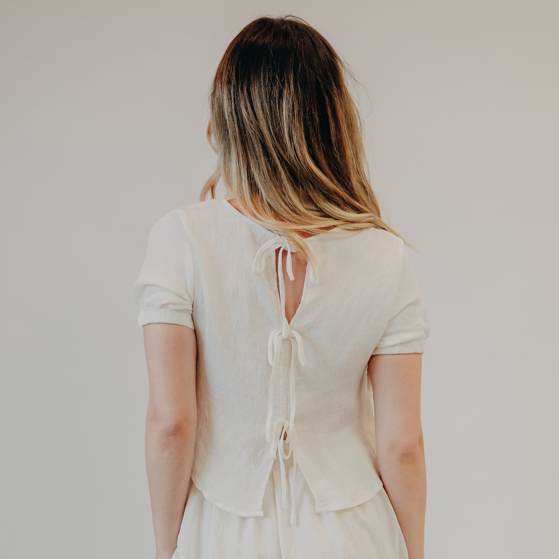This soft cream two-piece set feels effortlessly charming and endlessly versatile. The flowy top features short sleeves with subtle gathering and a trio of delicate back ties that add a sweet, romantic twist. Paired with a matching maxi skirt, this look is perfect for a relaxed summer gathering, coastal dinner date, or bridal shower brunch.