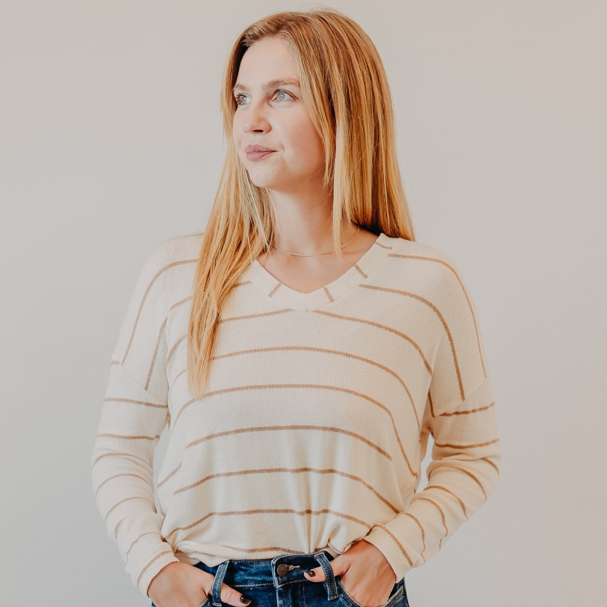 Laid-back yet polished, this lightweight striped knit is a true wardrobe essential. With its soft cream base and subtle camel-toned stripes, it feels effortless and timeless. The relaxed fit and v-neckline make it perfect for everyday wear—tuck it into denim for a casual look or layer it under a jacket for an easy office-ready outfit.