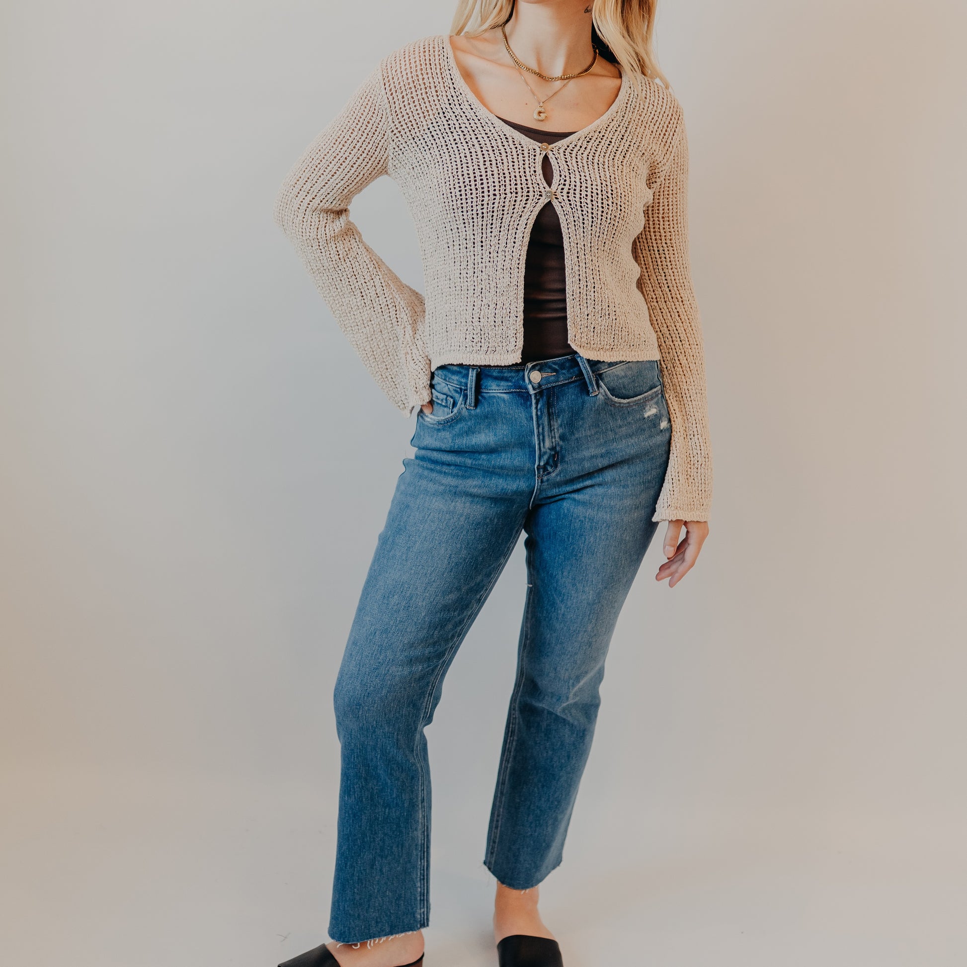 An easy everyday denim with just the right amount of structure. These mid-wash jeans feature a classic straight-leg silhouette with light distressing at the pockets for a casual, lived-in vibe. The cropped length makes them perfect for pairing with mules, sneakers, or boots, while the high rise keeps the fit flattering and versatile for all your go-to looks.