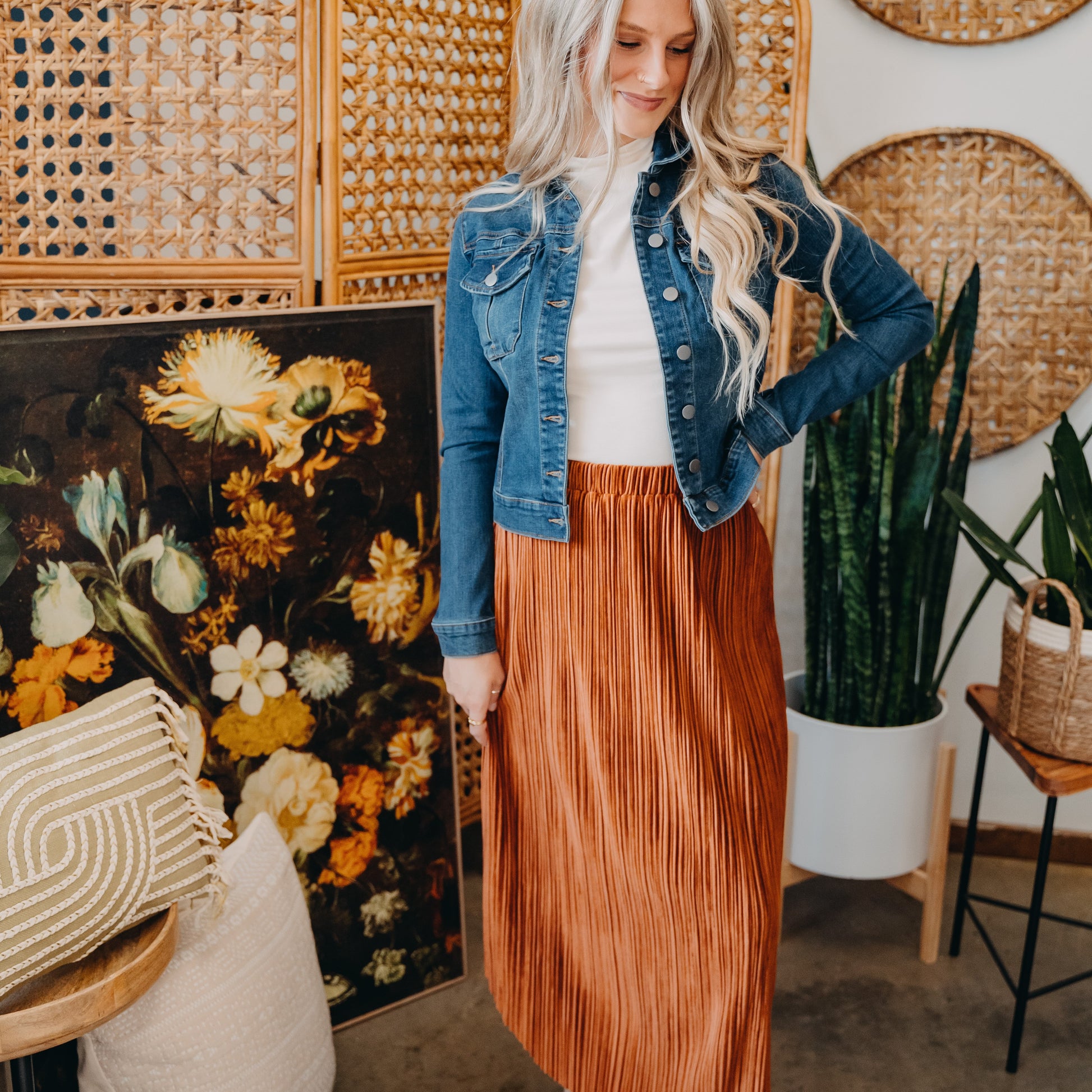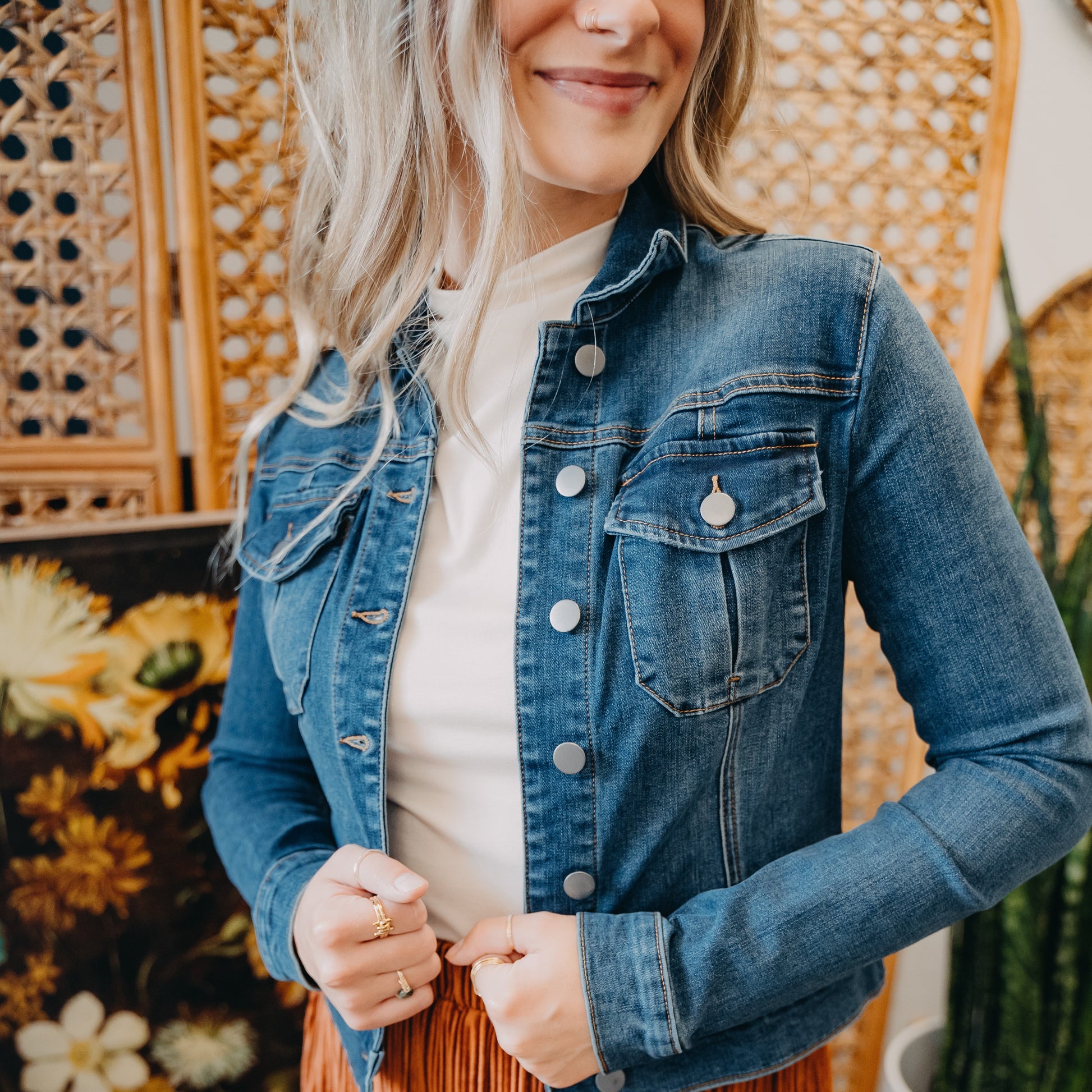 The jean jacket style isn't going anywhere, so why not grab one that you love?? This classic jean jacket is perfect for both formal + casual wear. The stretchy material feels like a hug from your favorite person!
