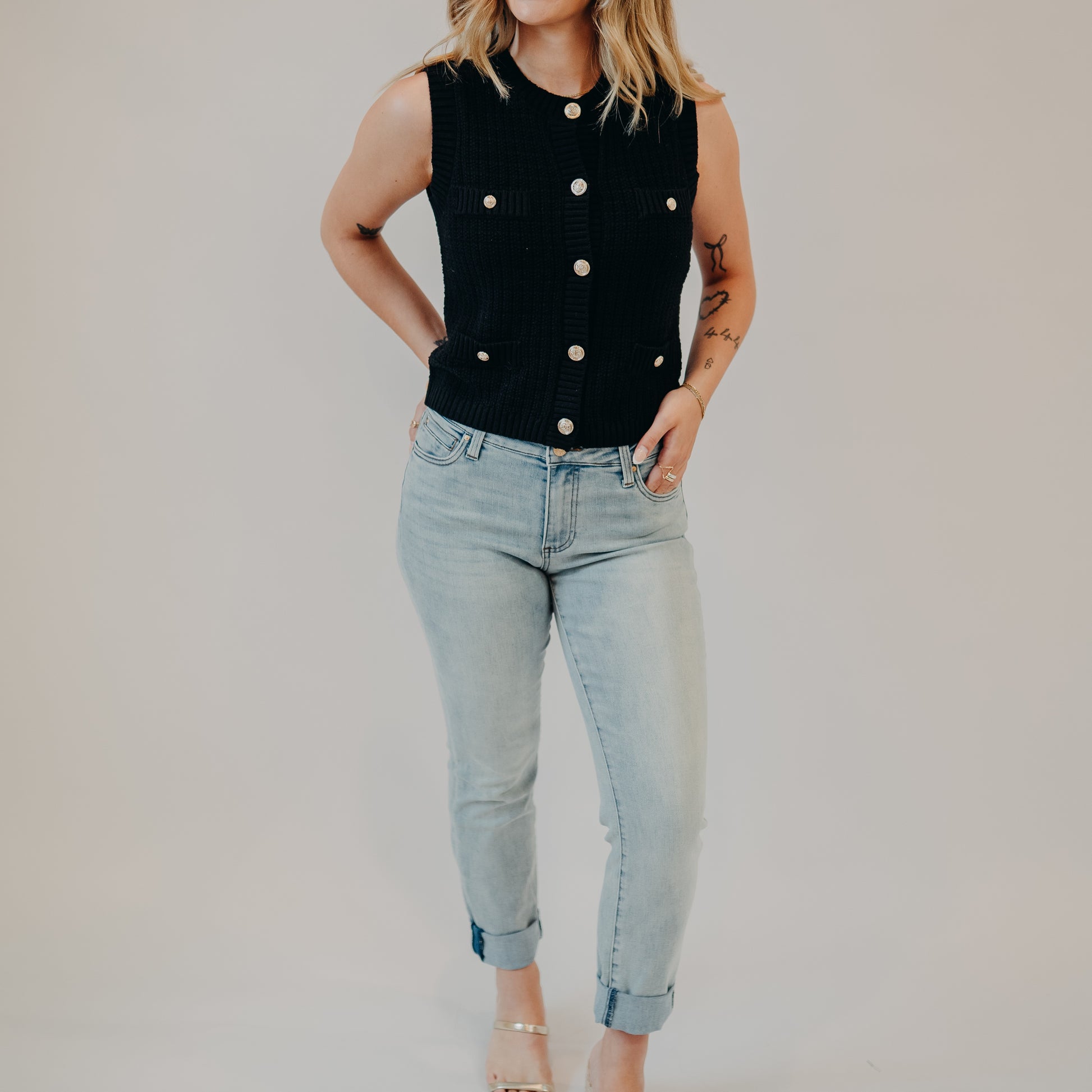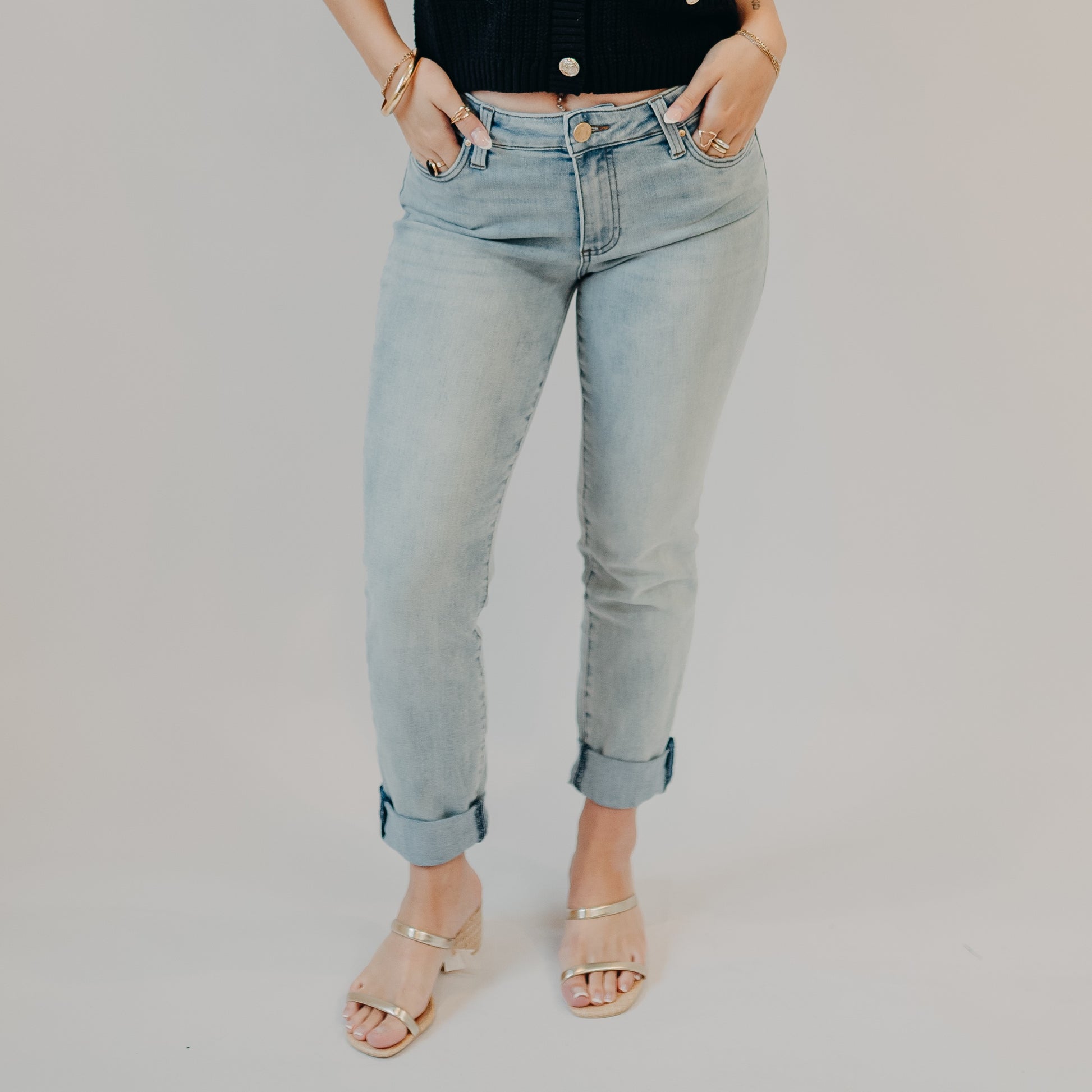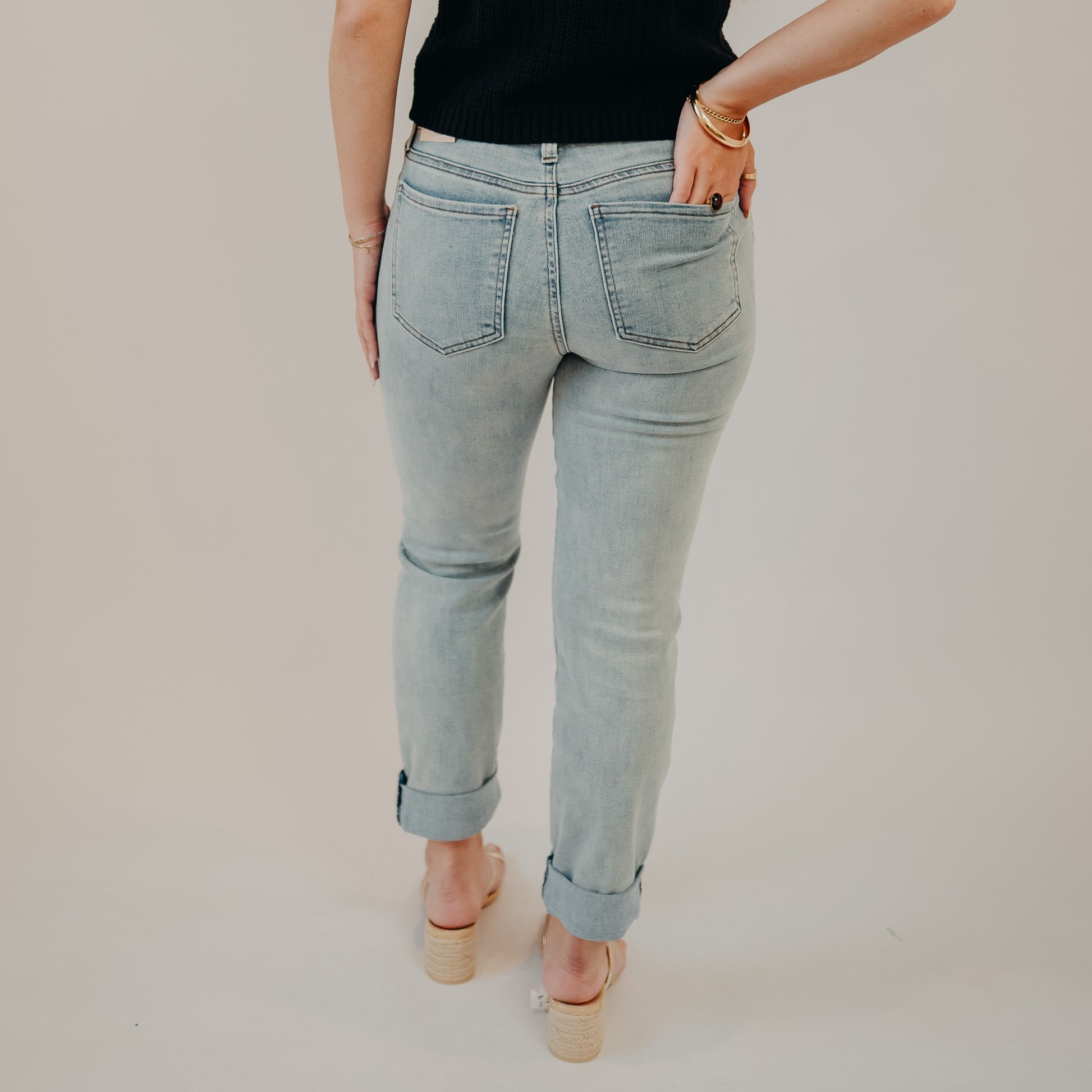 These light-wash jeans strike the perfect balance between timeless and trendy. The mid-rise fit hugs in all the right places, while the subtle stretch keeps them ultra-comfy for everyday wear. A cuffed hem adds a casual touch—just right for sandals now and boots later. Pair them with your favorite tank, sweater vest, or tee—these go with everything.