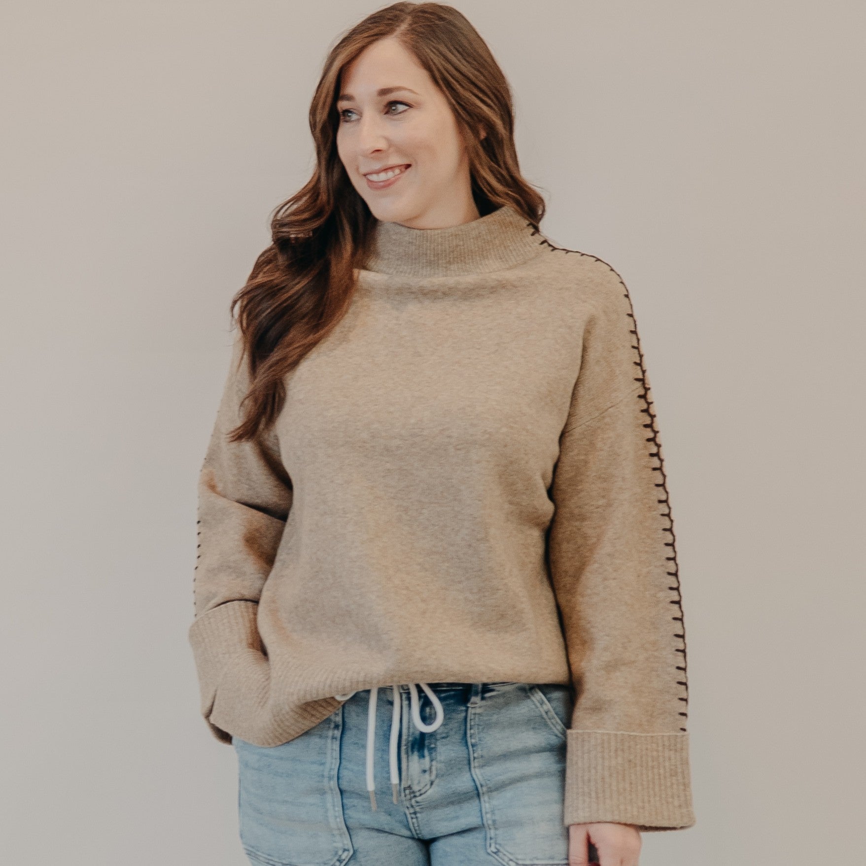 Effortlessly elevated with a cozy twist. This camel mock neck sweater features standout contrast stitching along the sleeves for that hand-done, artisanal feel. The relaxed silhouette and wide ribbed cuffs make it as comfortable as it is chic — perfect for pairing with light denim or trousers for a polished fall look.