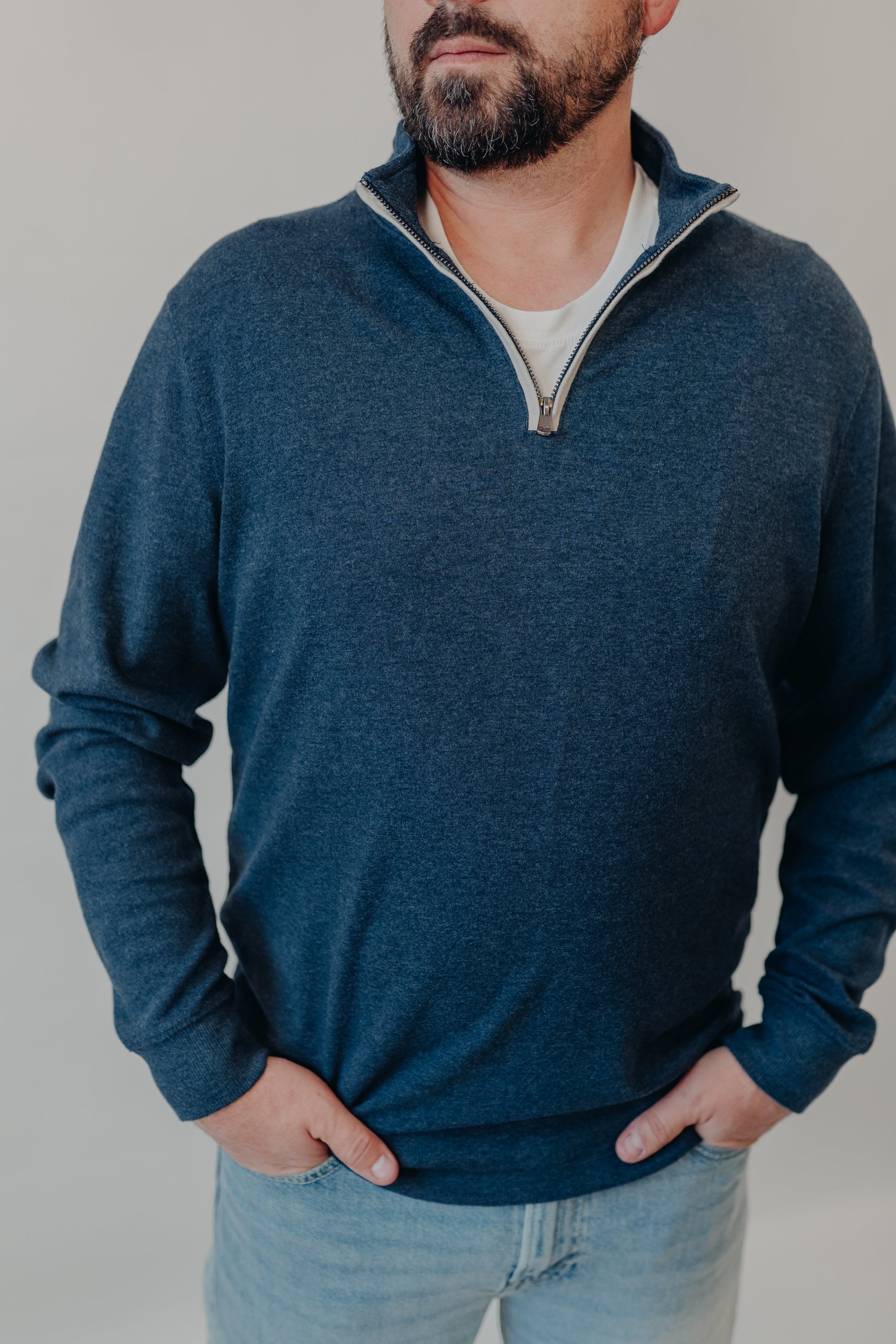 A CLASSIC, NAVY QUARTER ZIP PULLOVER. A POLISHED LOOK FOR ANYONE LOOKING TO UPGRADE THEIR WARDROBE.
