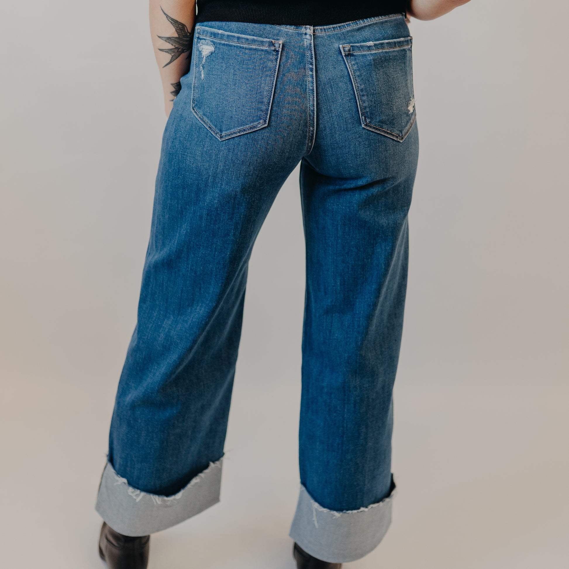 A statement spin on a timeless denim—these wide cuff jeans are made for bold, effortless dressing. Featuring a high-rise fit, a line silhouette, and dramatic rolled cuffs with raw edges, they’re the pair that instantly elevates even the simplest outfit. Perfect with ankle boots and a fitted knit, or keep it casual with sneakers and a tucked tee.