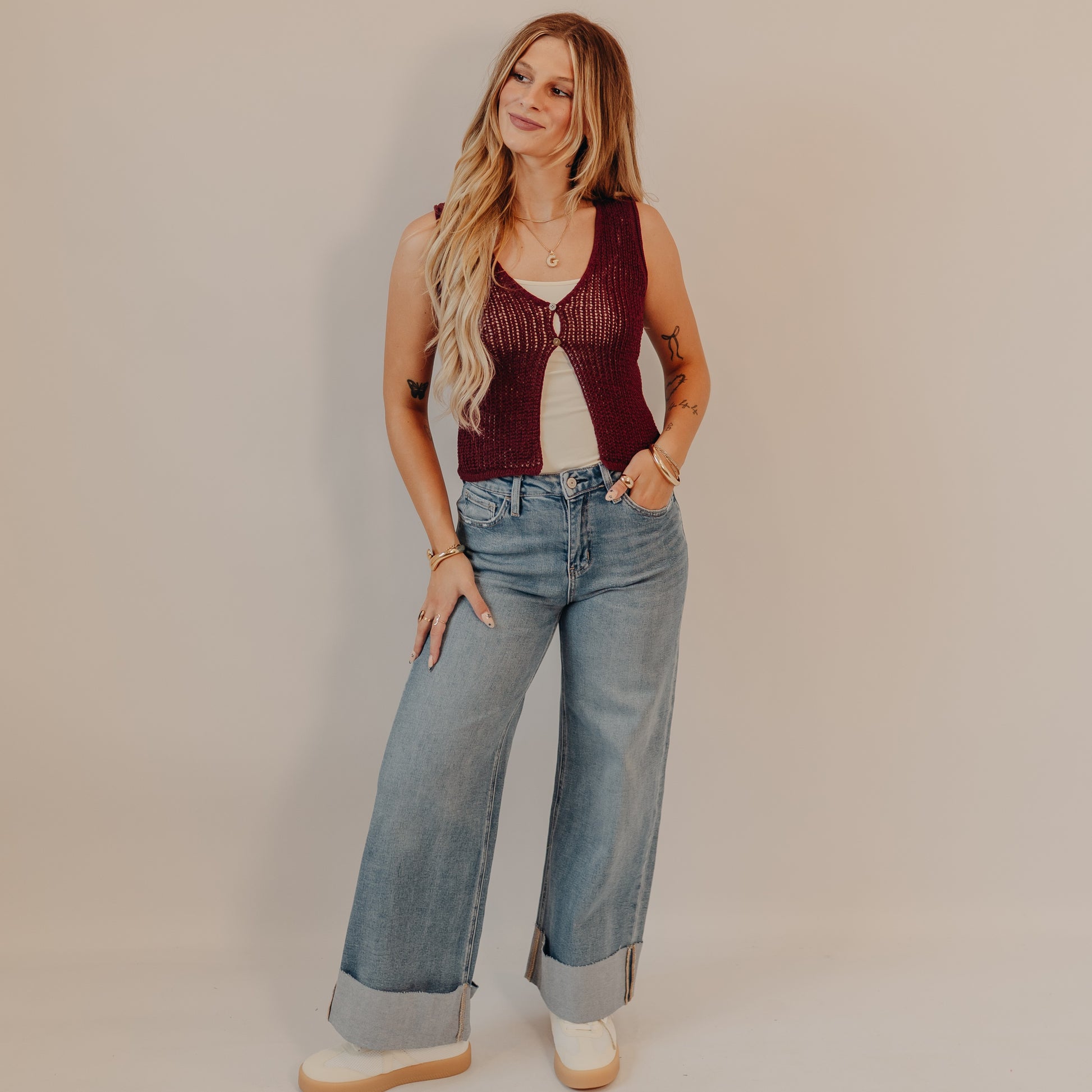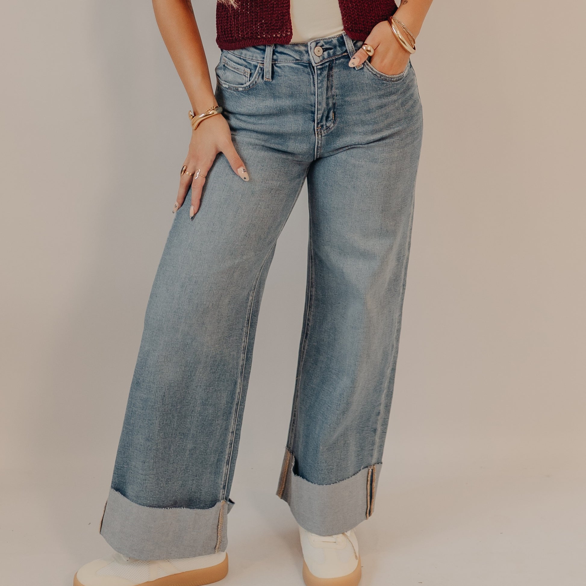 Bring a fresh twist to your denim lineup with these wide-leg cuffed jeans. Featuring a relaxed fit through the leg and an exaggerated cuff hem, they strike the perfect balance between casual and cool. The light wash makes them easy to pair with everything from sweaters to tanks, while the structured shape keeps them looking polished. Style them with sneakers for a laid-back day look or swap in heeled boots for a more elevated vibe.