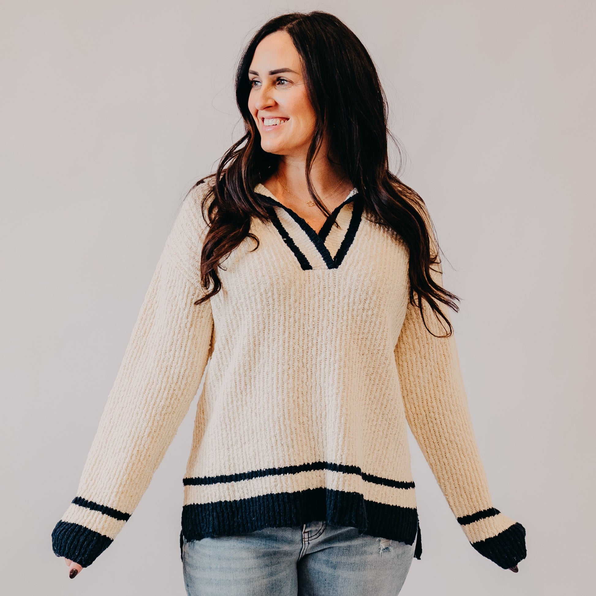 This cozy knit sweater features a subtle collar and a deep V-neckline with bold navy trim, adding a touch of preppy charm. The relaxed fit and soft cream fabric make it perfect for effortless, everyday styling. Pair it with denim for a chic, laid-back look.
