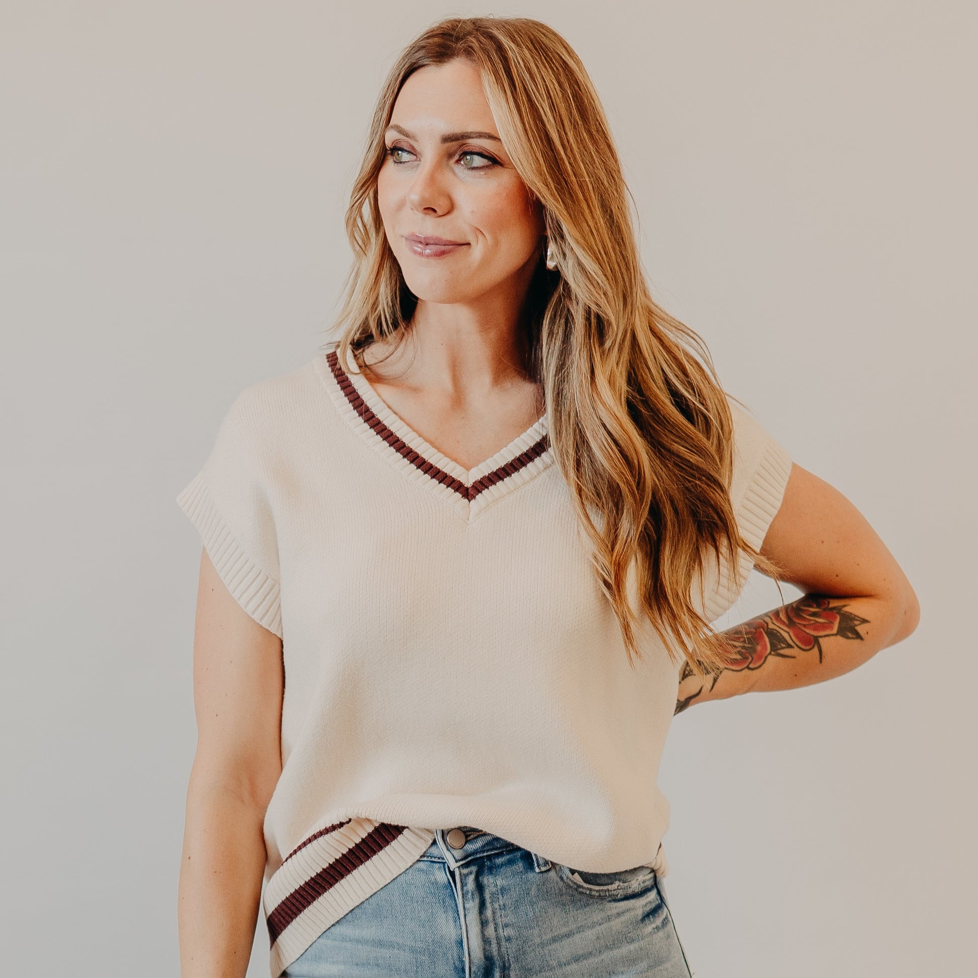 A classic knit with a sporty touch — this sleeveless sweater is the perfect layering piece for fall. Featuring a cream base with contrast brown stripes at the neckline and hem, it blends cozy texture with timeless style. Pair it with denim and loafers for an effortlessly polished look, or layer it over a button-down for that preppy-chic vibe.